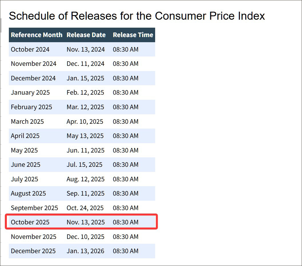 根据其官网列出的发布时间表,10月CPI数据本应于美东时间13日上午8点30分就公布,但数据迟迟未出。金融时报等外媒认为,由于此前美国联邦政府长期停摆,劳工统计局“可能根本无法发布10月的官方数据”。