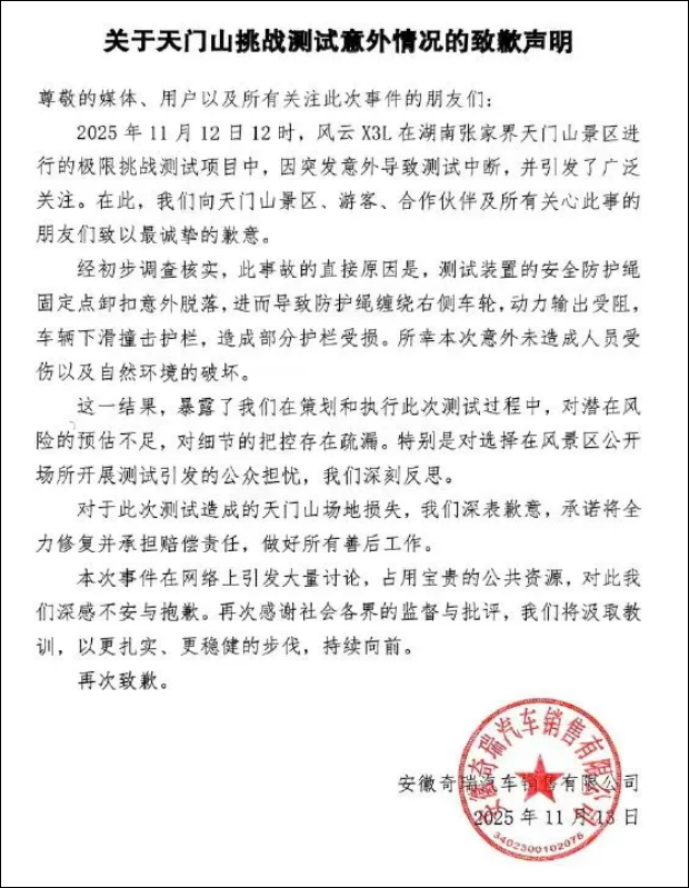 11月13日,奇瑞汽车在官方微博发布了关于天门山挑战测试意外情况的致歉声明: