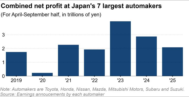 近年4—9月日本七大车企合并净利润变化 日经亚洲