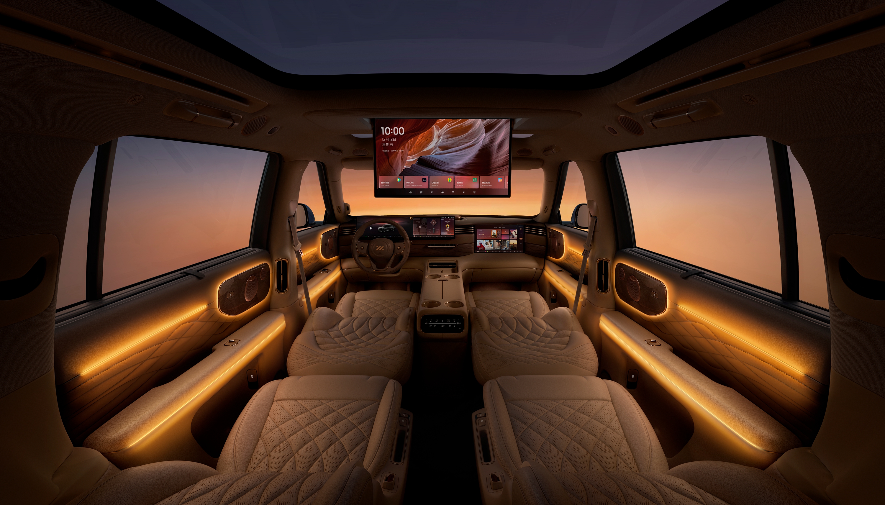 进入内部,智己LS9的内饰搭载Nappa真皮、皇家礼赞艺术木纹饰板、巴洛克渐变浮雕绗缝及加尼叶金装饰艺术。座椅配置方面提供六座布局,第二排配备零重力座椅,车内二排最大腿部空间1207mm,二排最大膝部空间265mm,三排头部空间955mm,三排坐垫深度515mm,并搭载4D机械按摩座椅、B&O品牌25扬声器音响系统、21.5英寸4K二排娱乐屏与12.3L双开门冰箱等配置。新车还支持ERNC 2.0主动降噪技术和瞬净新风系统。