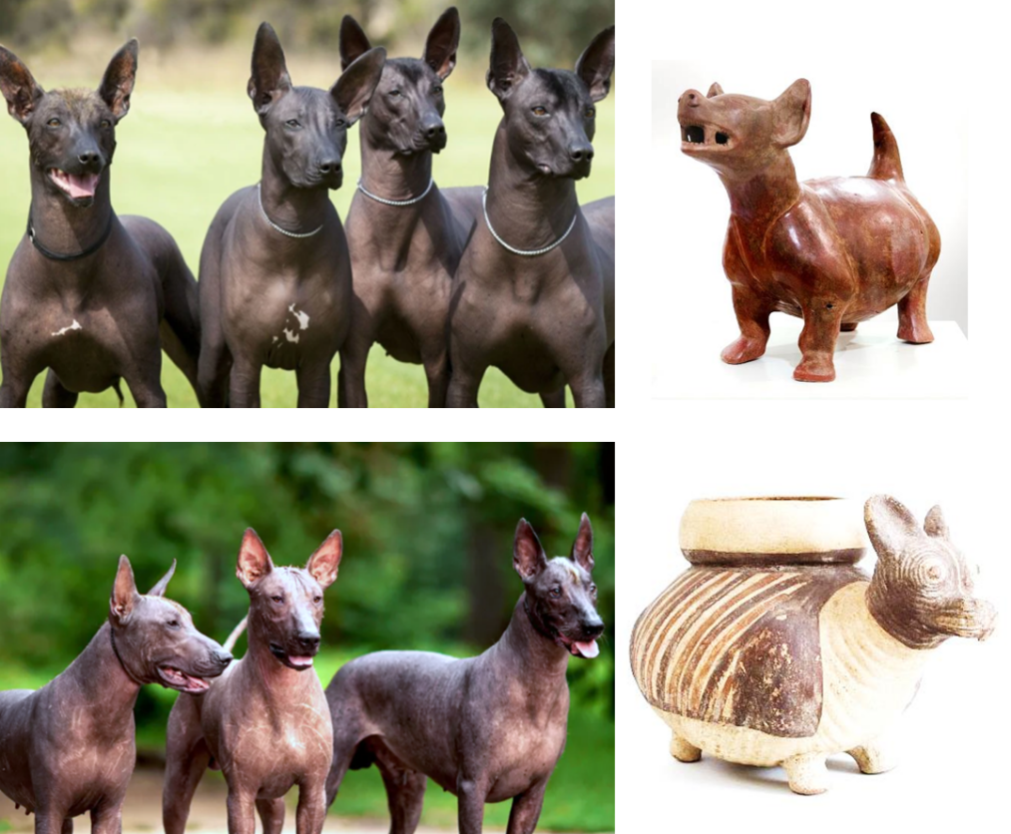 秘鲁裸犬(左上)、钱凯文化中的秘鲁裸犬(右上)、墨西哥裸犬(左下)、中美洲科马拉文化中的墨西哥裸犬(右下)