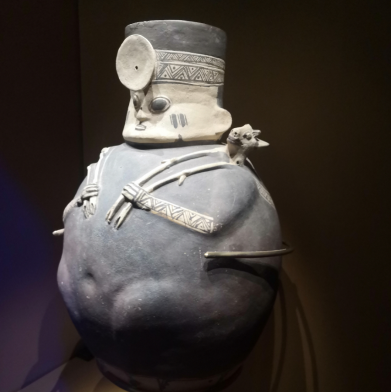 图为利马Larco博物馆收藏的钱凯文化水罐,一名精英猎人准备献祭一只他负在背上的小鹿。