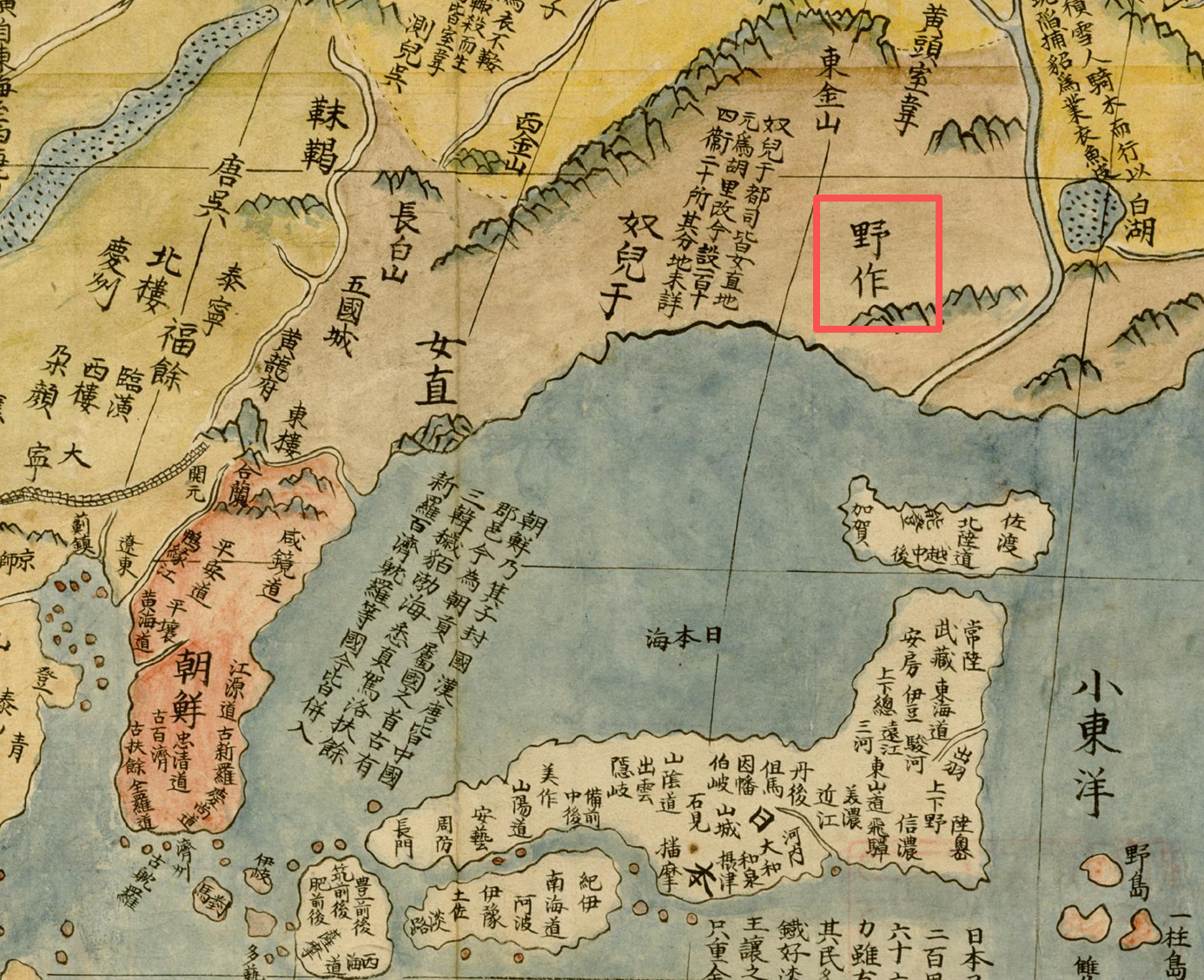 在《坤舆万国全图》中,误认为“野作”地区是河流分割而非海洋隔离的岛屿,但是与日本本土的填色截然不同,而归属于奴儿干都司。