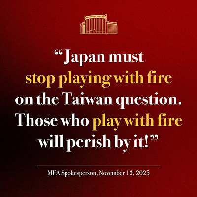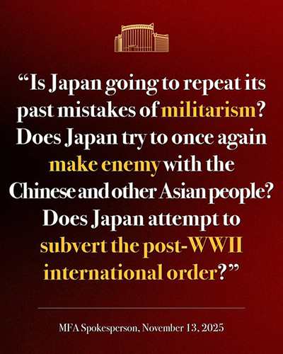 11月13日,外交部官方账号在社交媒体X平台连发六张海报,使用日英双语警告高市早苗。