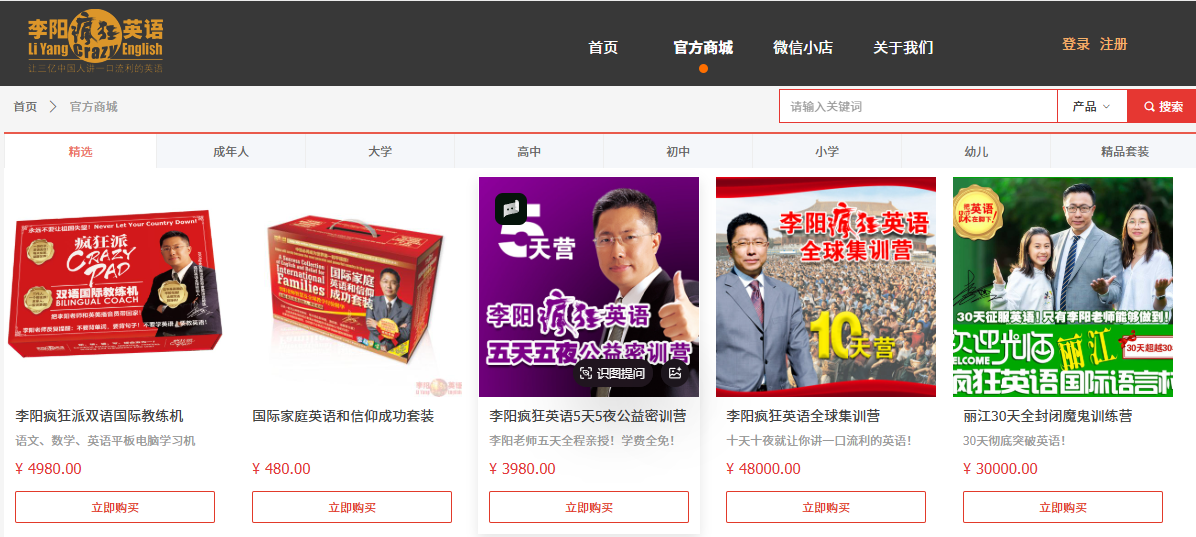 同时,官网还售卖“5天5夜公益密训营”和“丽江30天全封闭魔鬼训练营”,售价分别是3980元和30000元,此外,还有4980元的双语国际教练机和各类英语书籍在售。