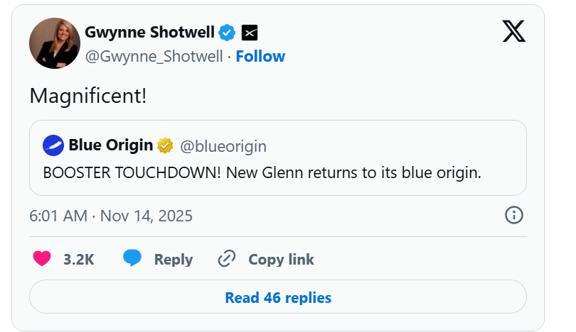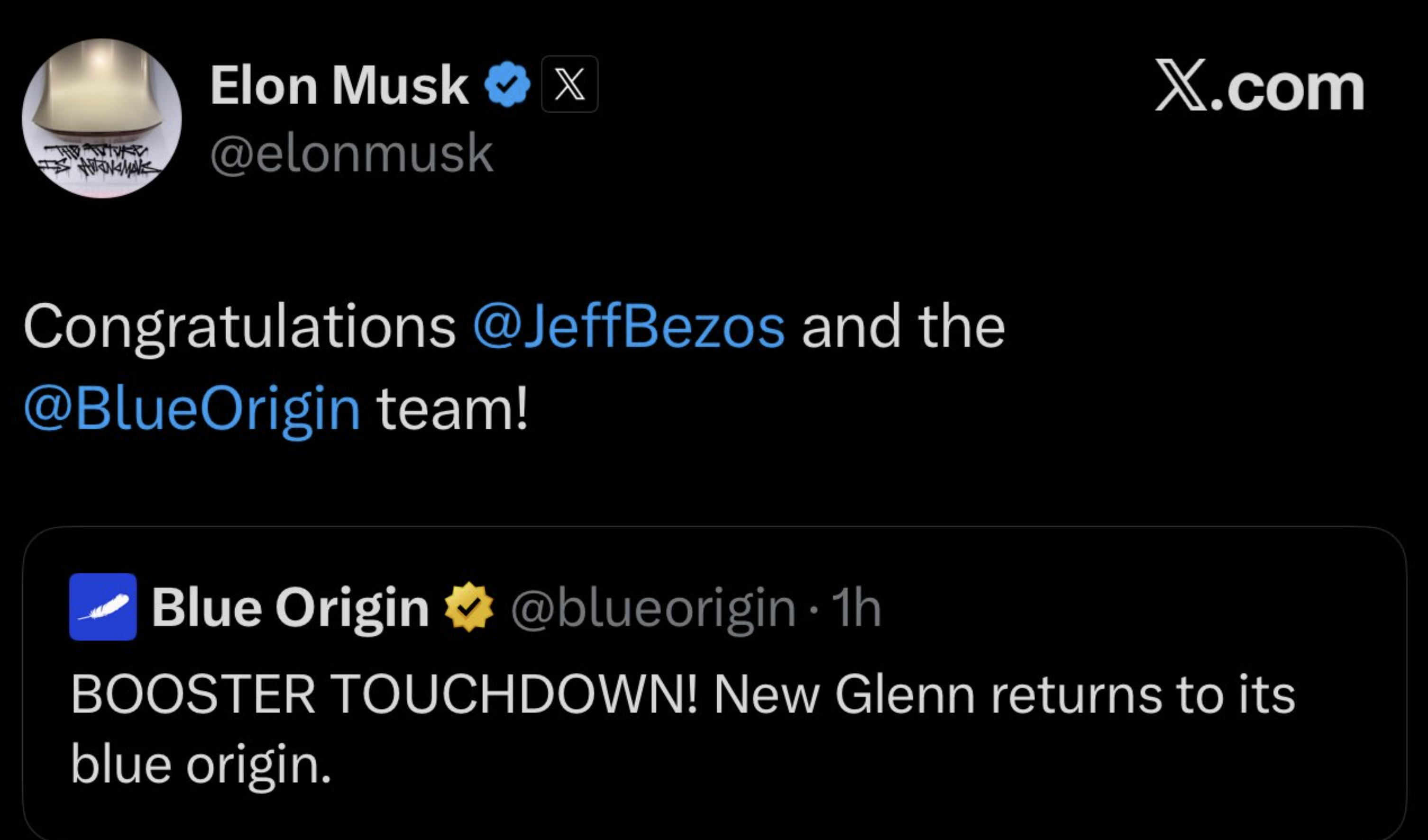 这或许让蓝色起源有能力与 SpaceX 展开竞争,目前后者凭借猎鹰 9 号、猎鹰重型和星舰火箭主导着全球发射市场。这一发射也引来了同行 SpaceX 的祝贺,SpaceX 的 CEO 格温·肖特维尔(Gwynne Shotwell)在 X 上发帖表示“太棒了”,SpaceX 创始人马斯克随后也表达了自己的祝贺。
