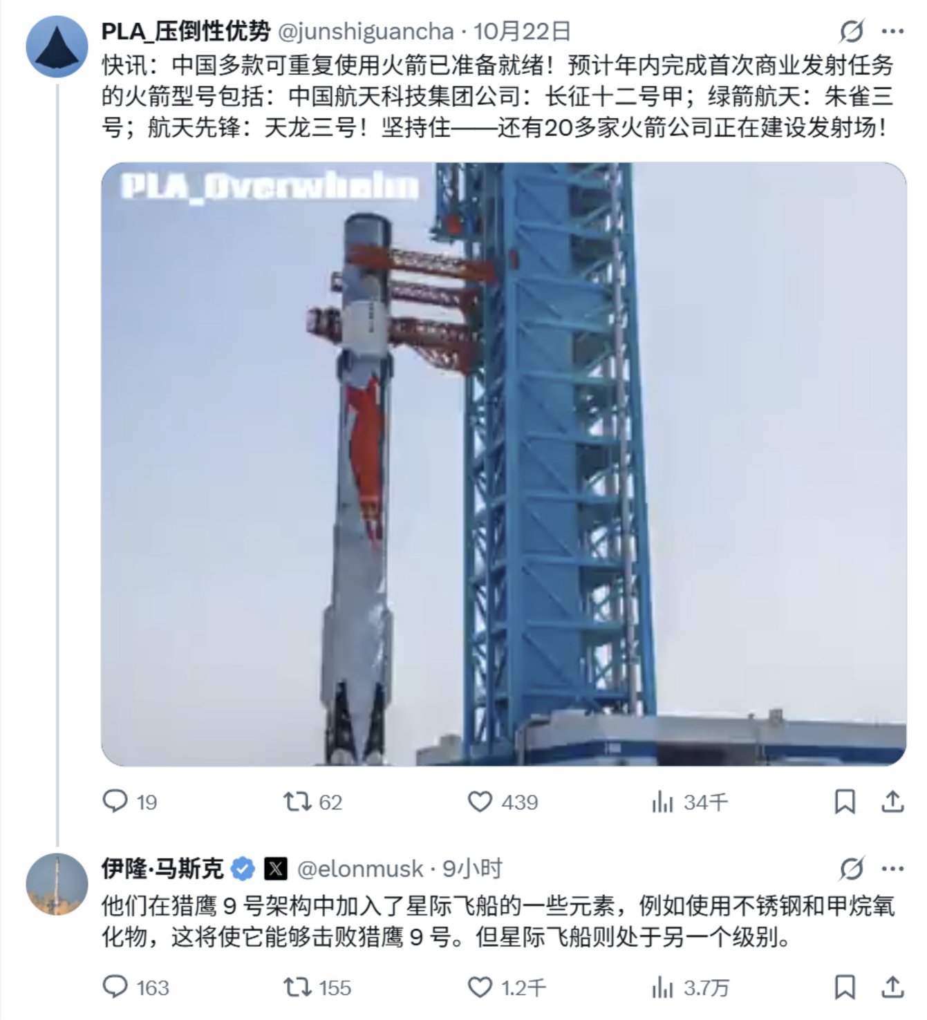 “朱雀三号融合了猎鹰9号架构与星舰部分特性,具备挑战现有可复用火箭市场格局的潜力”,马斯克此前也在社交平台上点赞,引起全球航天圈的震动。