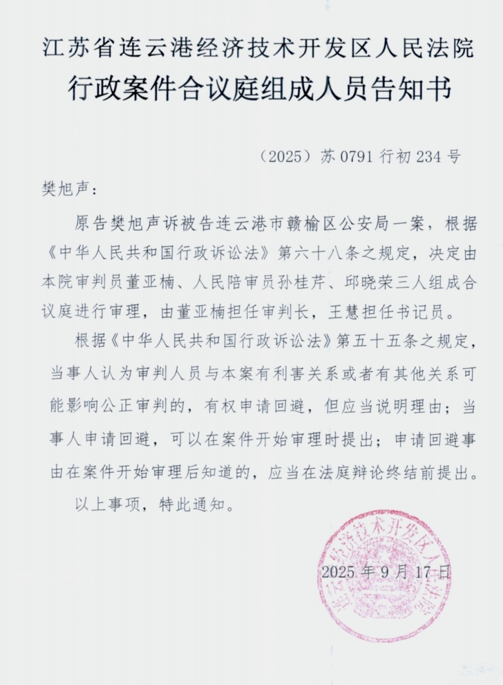 樊旭声起诉赣榆区公安局一案由连云港开发区法院审理。图为法院告知书。