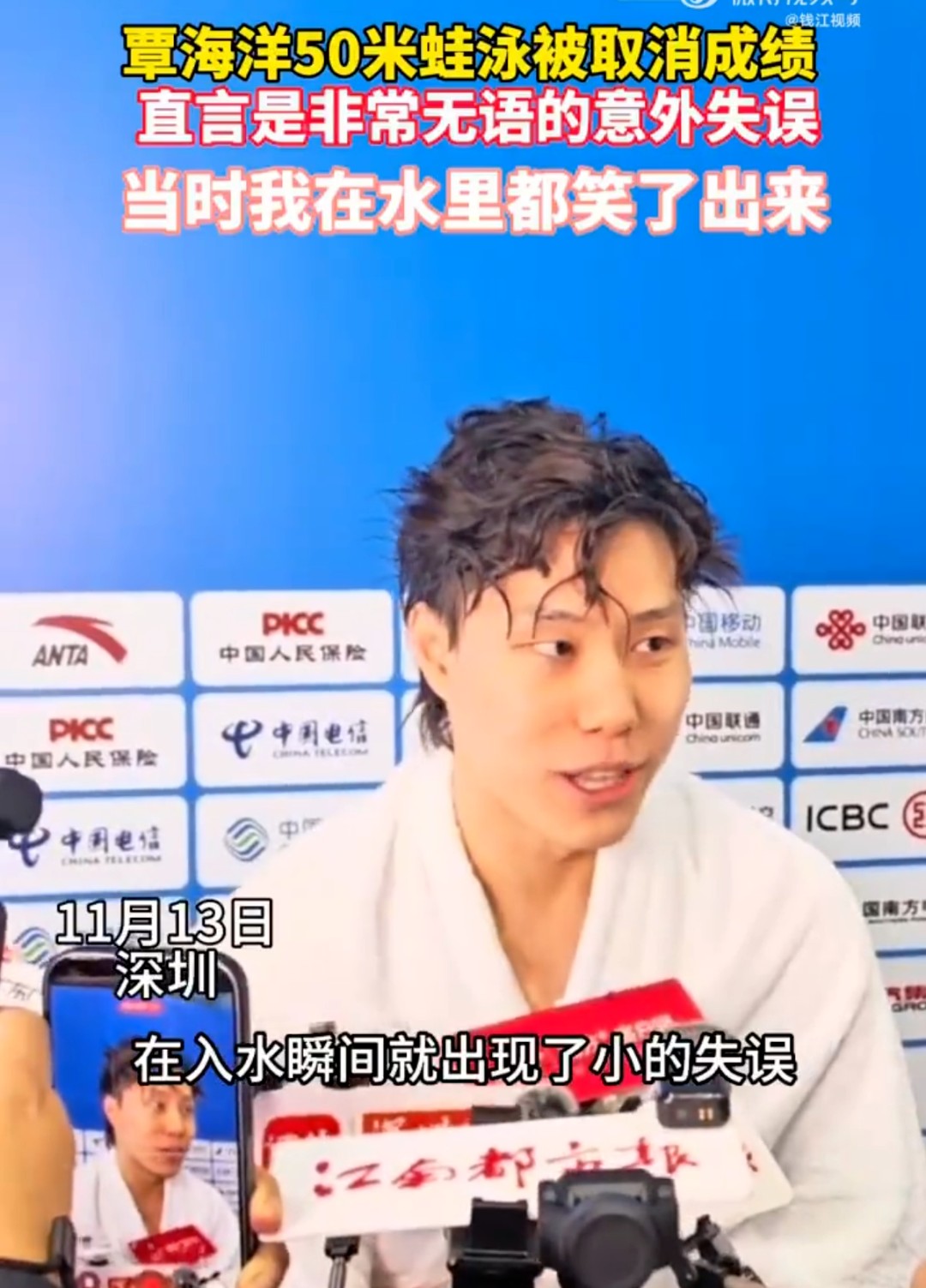 赛后,覃海洋表示,正常情况拿下这枚金牌没问题,但从跳台入水的时候出现了一点小意外,由于专注思考水中节奏动作,“出发入水的时候手没有并拢,就停那儿了。在那一瞬间,我觉得游完之后有可能出现犯规的情况。不过我当时也没想那么多,及时去调整了一下,最后到边成绩能有前三已经蛮吃惊的了。”