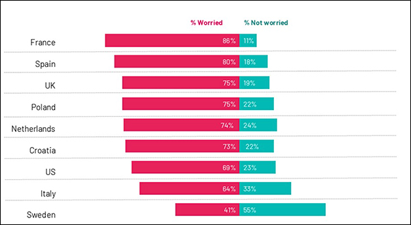 从国家来看,法国、西班牙分别有86%和80%的受访者对未来五年本国民主前景感到担忧,是比例最高的两个国家,其后依次是英国(75%)、波兰(75%)、荷兰(74%)、克罗地亚(73%)、美国(69%)、意大利(64%),只有瑞典的比例低于一半,为41%。