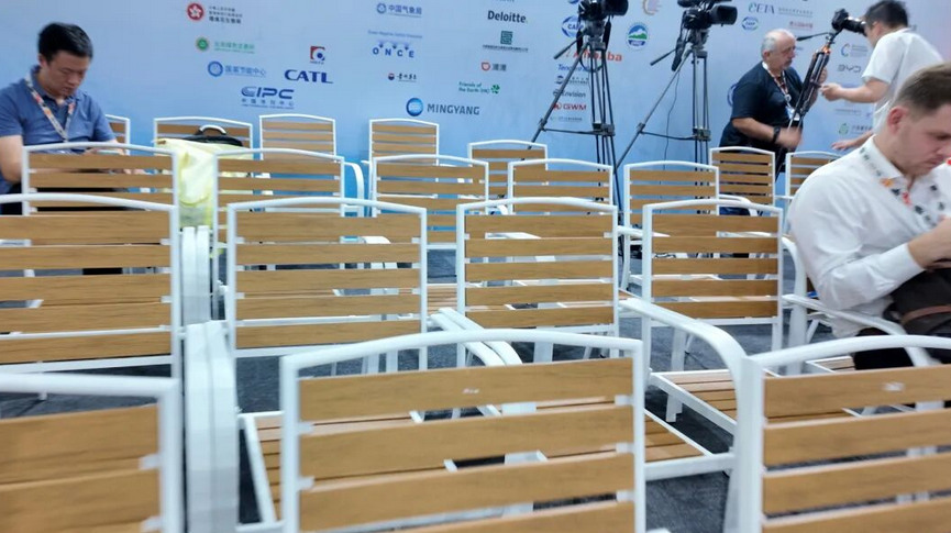 中国角现场共摆放210把这样的椅子、30张桌子。“等会议开完了,这些桌椅也不会浪费掉,我们将捐赠给当地,实现最大化利用,充分体现了节能降碳、资源再生的绿色环保理念。”裴晓菲介绍道。