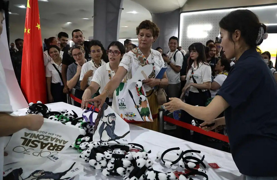 11月10日,在巴西贝伦,与会代表在COP30“中国角”领取纪念品。新华社