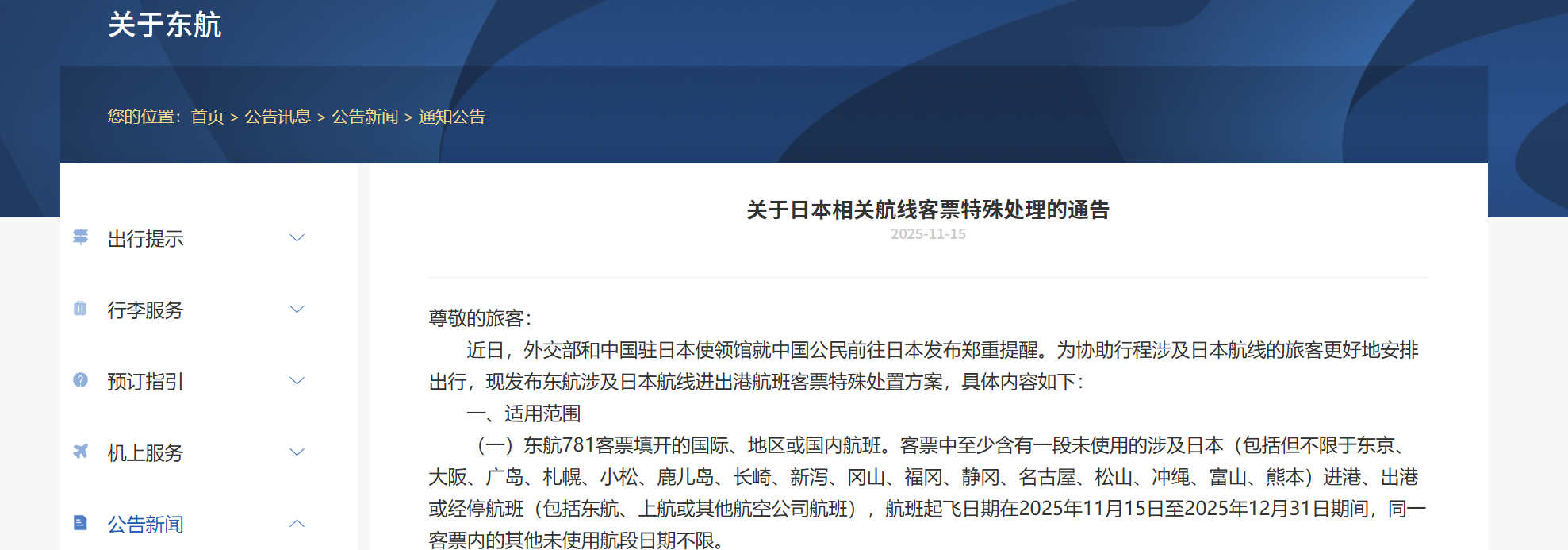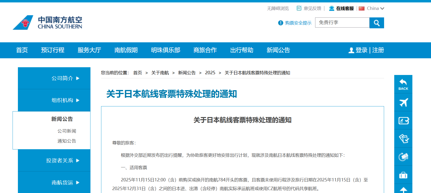 南航发布的适用范围为:2025年11月15日12:00(含)前购买或换开的南航784开头的客票,且客票未使用行程涉及旅行日期在2025年11月15日(含)至2025年12月31日(含)之间的日本进、出港(含经停)南航实际承运航班或使用CZ航班号的代码共享航班。