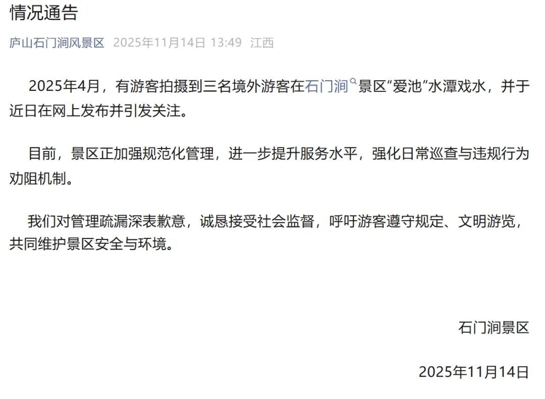 江西省九江市庐山石门涧风景区微信公众号11月14日发布情况通告: