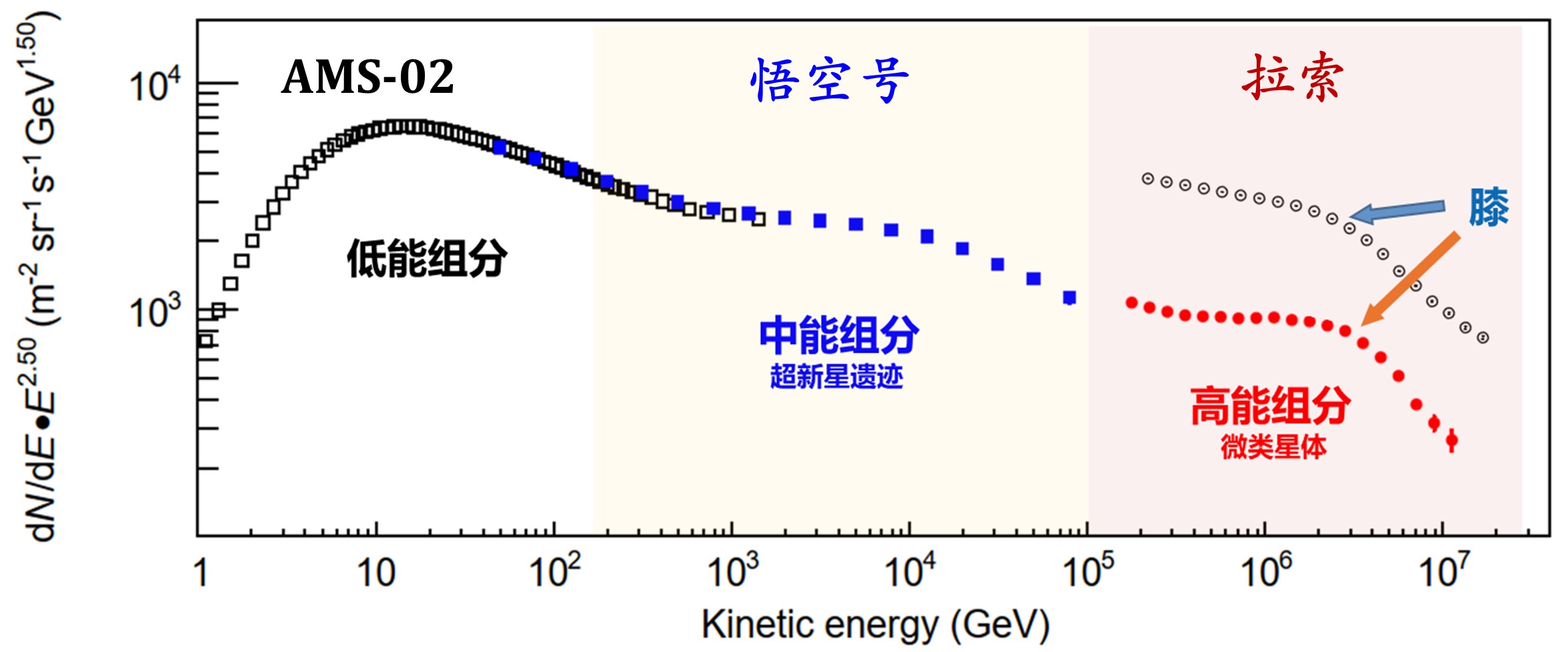 在广阔的宇宙中,无数以近光速飞行的微观粒子穿梭不息,我们称之为宇宙线。宇宙线自从被发现以来,通过空间和地面的实验探测,科学家们绘制出了宇宙线全粒子能谱。在能谱上有一个独特的拐折结构,因其形似人的膝盖,所以被称为“膝”结构。这一现象其实已经被发现近70年,但是其物理成因一直是未解之谜。