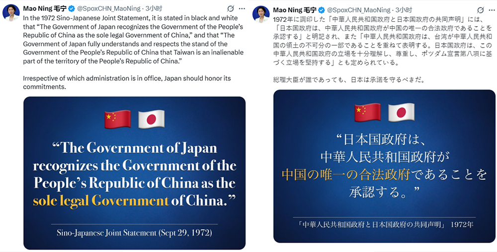 11月16日,中国外交部发言人毛宁在X网站用英语、日语双语发布2组共4张海报,援引1972年《中日联合声明》中涉台内容,提醒日方:“无论谁当政,日本都必须信守承诺”。