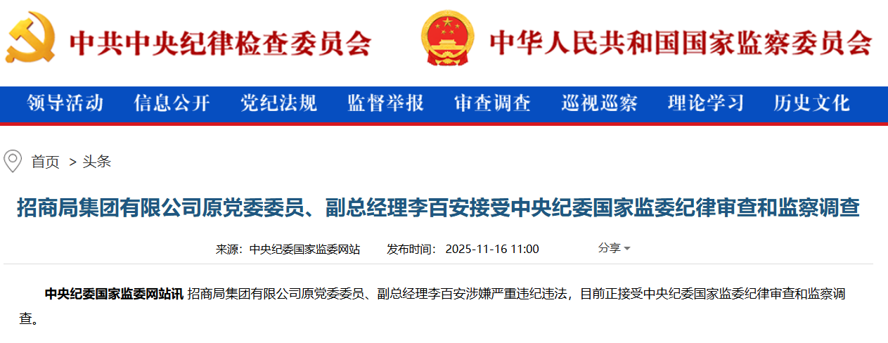 据中央纪委国家监委网站11月16日消息,招商局集团有限公司原党委委员、副总经理李百安涉嫌严重违纪违法,目前正接受中央纪委国家监委纪律审查和监察调查。