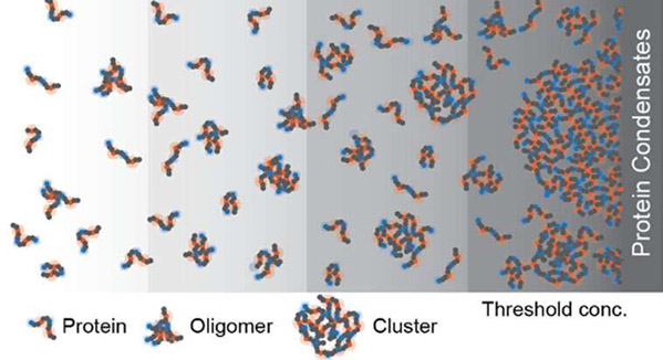 而我们现在知道,在人体细胞和许多其他复杂动物的细胞中,形成了被称为生物分子凝聚体(biomolecular condensates)的结构。它们是一种松散的球状物,有点像细胞中的液滴,与细胞其余部分的液体分离。它们是独立的相,就像沙拉酱里的油和醋一样。