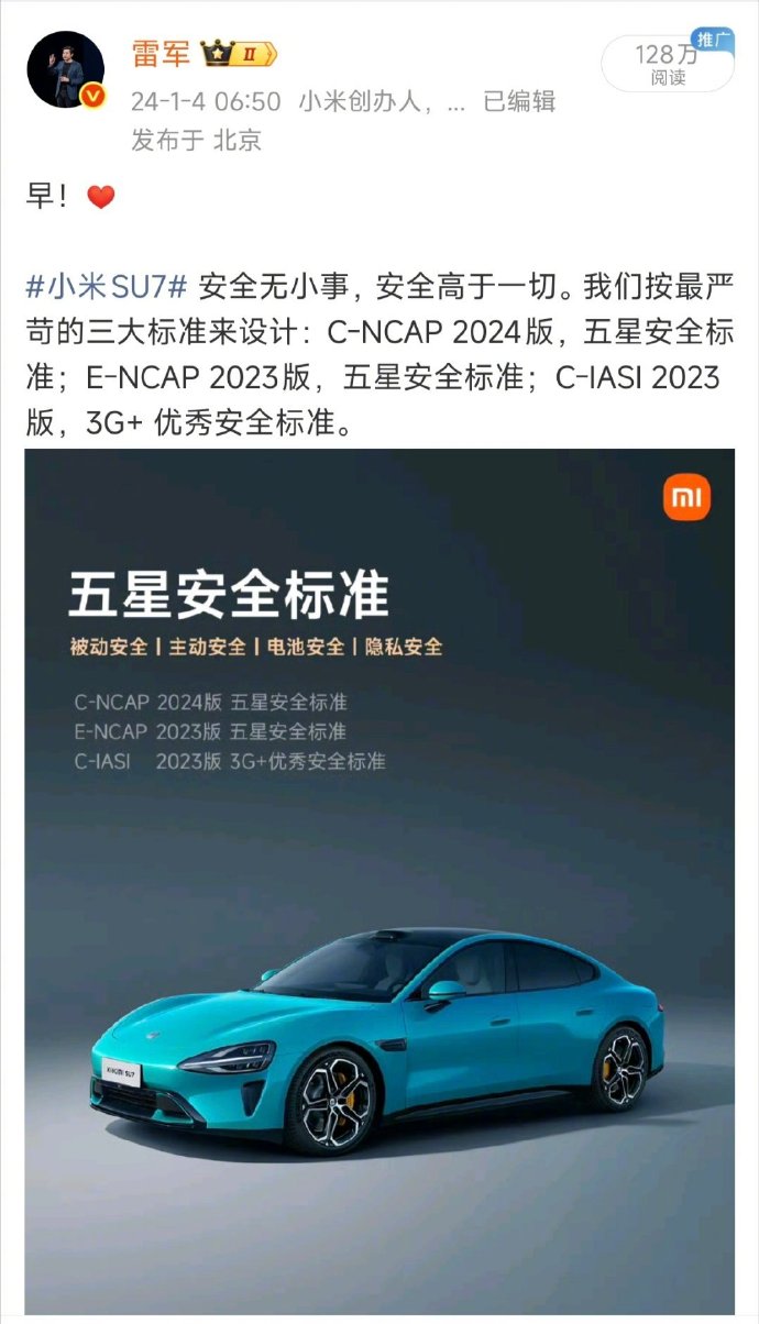 在微博中,附上他于2023年和2024年发布的四则微博截图,称“这是小米SU7发布之前我发的微博,我谈对安全的理解和SU7的研发标准。”