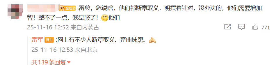 雷军则回应称:“网上有不少人断章取义、歪曲抹黑。”