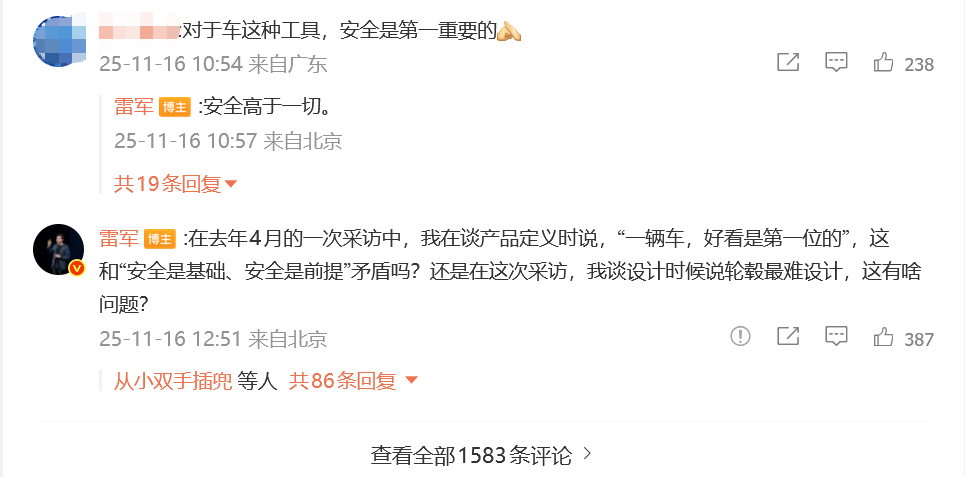 11月16日,雷军连发多条微博,重申小米汽车安全设计理念。