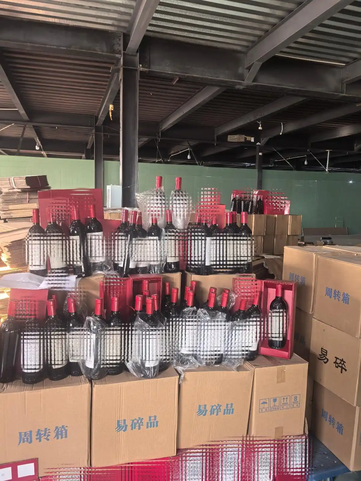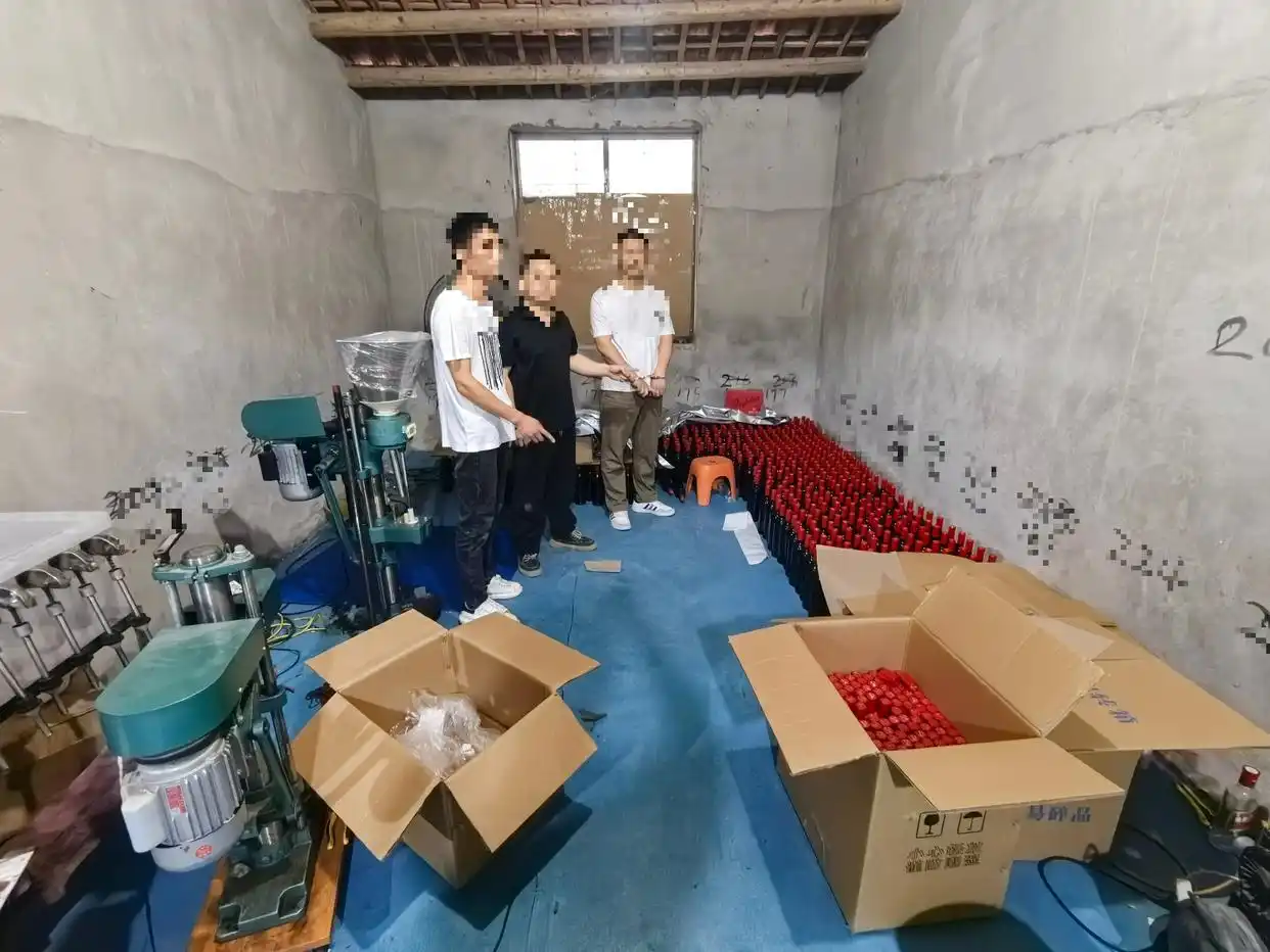民警当场将三人控制,并对现场进行了彻底搜查。眼前的景象令人震惊:民房门口停放的面包车上已装载了50箱共计300瓶假酒;打开民房大门,里面“别有洞天”—四五间被隔断的房间里,堆满了已经封装完毕的假冒某品牌红酒成品、等待贴标的半成品、堆积如山的空酒瓶和包装盒。经清点,现场共查获假冒红酒成品及半成品4313瓶,包装盒、酒瓶等大量包装材料,以及灌装机、贴标机等成套生产设备。