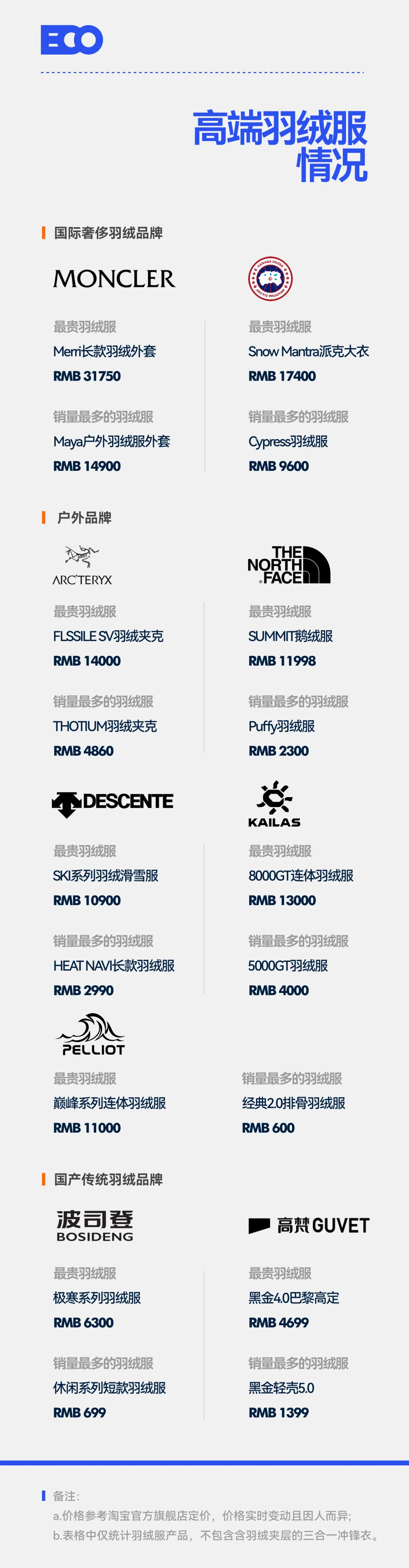 一是以加拿大鹅、Moncler为代表的国际奢侈羽绒品牌,价格基本上都在万元以上;