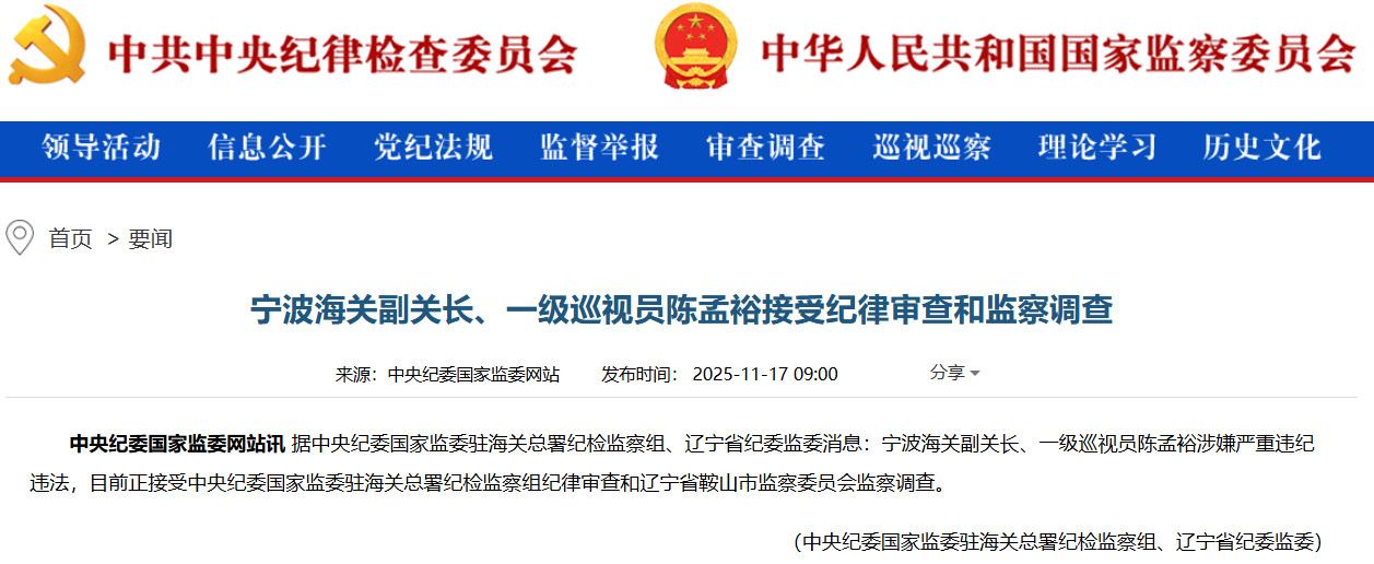 据中央纪委国家监委网站11月17日消息,据中央纪委国家监委驻海关总署纪检监察组、辽宁省纪委监委消息:宁波海关副关长、一级巡视员陈孟裕涉嫌严重违纪违法,目前正接受中央纪委国家监委驻海关总署纪检监察组纪律审查和辽宁省鞍山市监察委员会监察调查。