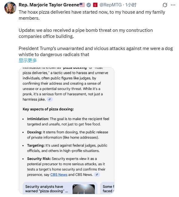 当地时间11月16日,格林在X网站发文称:“现在已经开始有恶作剧披萨送到我家和我的家人那里了。我的建筑公司办公楼还收到了管状炸弹威胁。特朗普总统对我无端且恶毒的攻击,无异于向危险的激进分子发出暗号,可能会导致我和家人遭遇严重袭击。”