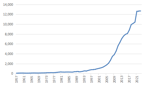 1957-2023年中国人均GDP的增长情况(单位:美元) 数据来源:国家统计局 作者制图