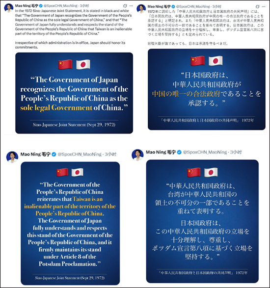 值得一提的是,昨日(16日),毛宁也在该平台上用英语、日语双语发布2组共4张海报,援引1972年《中日联合声明》中涉台内容,提醒日方:“无论谁当政,日本都必须信守承诺”。