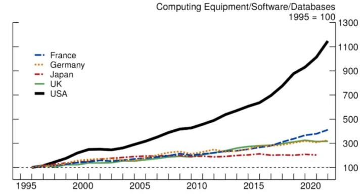还有一个不容忽视的重要原因是早期投资。美国在计算、软件和数据库领域进行了早期且超大规模的投资,从1995年到2021年,这些领域的年度实际投资增长了十倍以上,远远超过其他先进经济体的增长幅度(后者仅为2至4倍)。这些早期投资提供了计算能力、网络和硬件,使美国在AI相关创新和扩散方面处于早期领先地位。