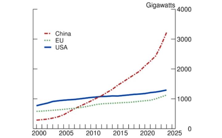 不过在能源基础设施上,中国更具优势。数据中心带来了电力需求大幅增长。十多年前,中国的发电容量超过了美国,装机容量约为3200吉瓦,而美国为1293吉瓦,欧盟为1125吉瓦。仅2024年,中国就增加了429吉瓦的净发电容量,是美国净新增容量的15倍多。国际能源署预计,到2030年,全球数据中心的电力消耗将增加一倍以上,其中美国和中国占增长的80%。