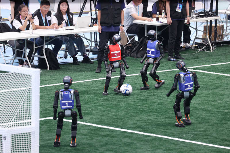 2025年8月17日,北京,人形机器人在2025世界人形机器人运动会的足球决赛中比拼。 东方IC