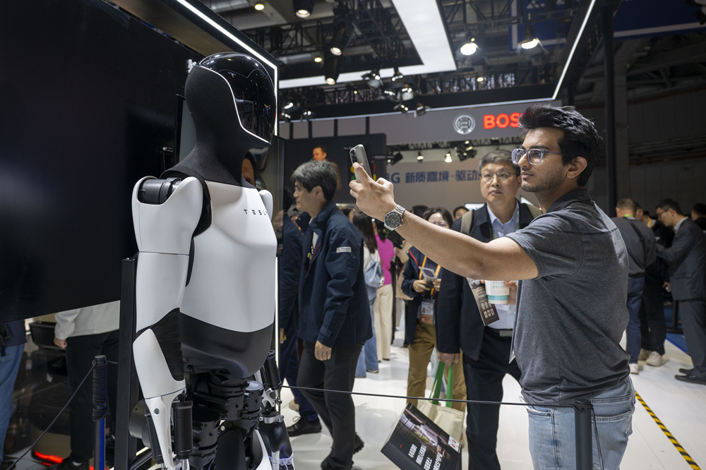 2025年11月8日,在第八届进博会汽车及智慧出行展区,特斯拉人形机器人吸引参观者目光。 东方IC