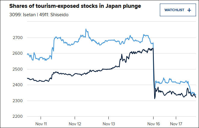 随着中方相继发布留学和旅游提醒,日本东京股市百货公司、运输、消费等旅游相关股票11月17日遭到抛售。三越伊势丹百货公司股票收盘下跌11.31%,高岛屋收盘下跌6.18%,对中国游客消费依赖度较高的资生堂收盘下跌9%,东京迪士尼度假区运营商日本东方乐园公司收盘下跌5.68%。
