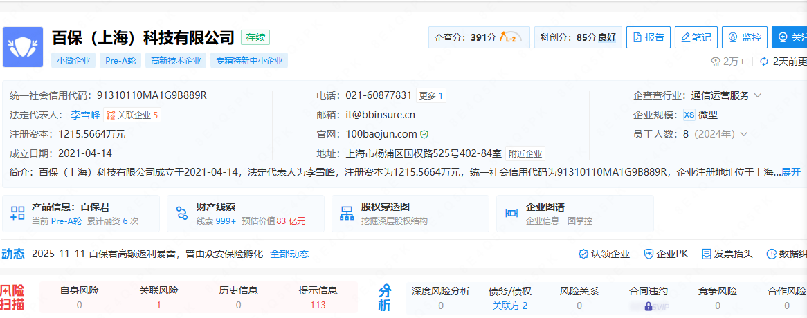 众安保险回应称,公安机关已经立案调查,目前处于侦查阶段。百保君运营方百保(上海)科技有限公司的法定代表人、实控人为李雪峰,此人曾担任众安科技CTO(首席技术官)。众安保险表示,旗下子公司众安科技已于2025年5月转让百保君运营方百保公司全部股权,未参与实际经营管理,并强调同属受害者。