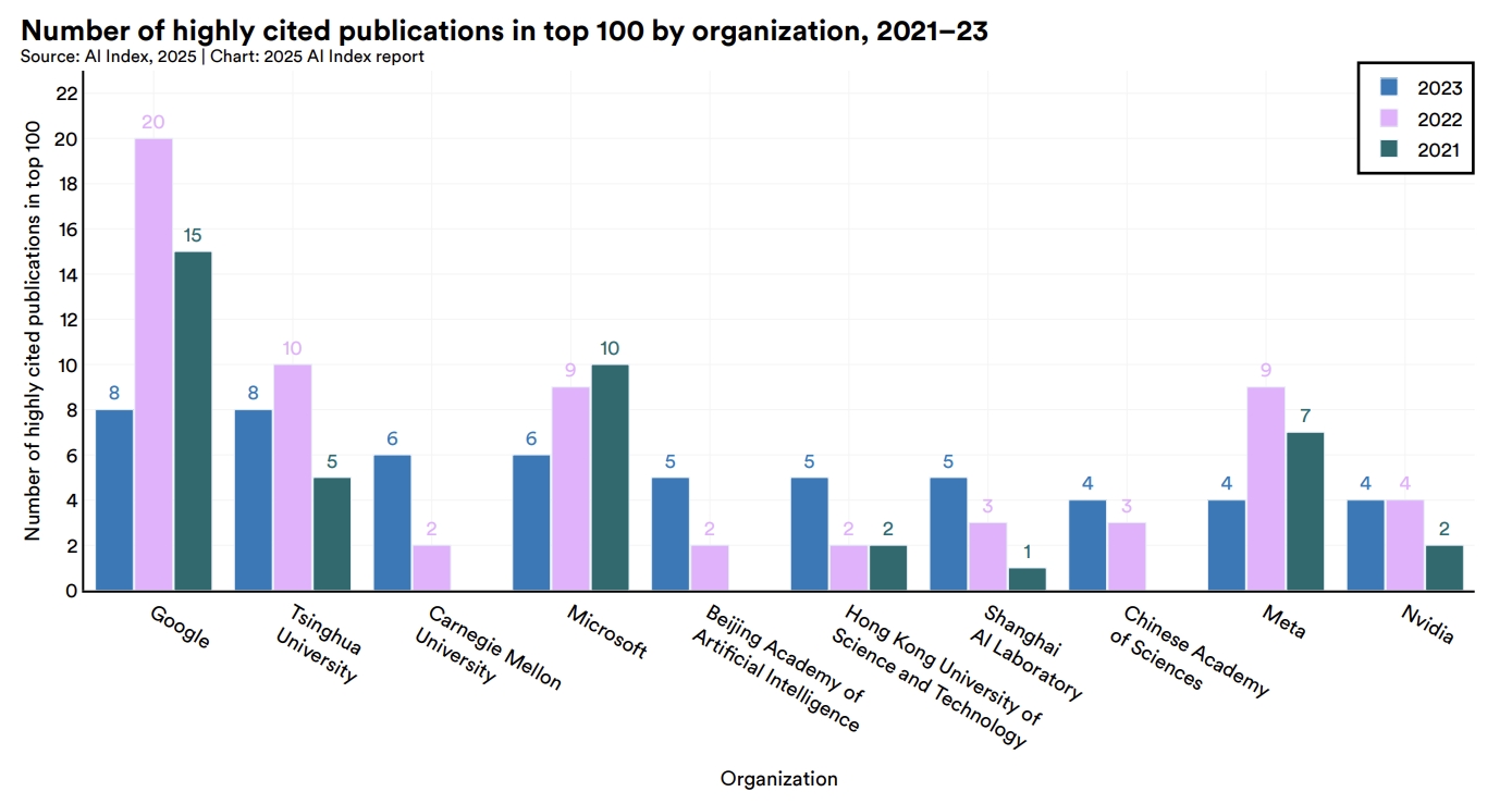 不过目前,美国在人工智能领域仍保有最具影响力的专利与性能最优的模型。例如,在专利影响力排名中,哈佛大学与麻省理工学院始终领先于清华大学。斯坦福大学发布的《人工智能指数报告》也显示,2024年美国科研机构研发的知名人工智能模型达40个,而中国为15个。但在部分性能测评指标上,中国机构正逐步缩小与美国的差距。