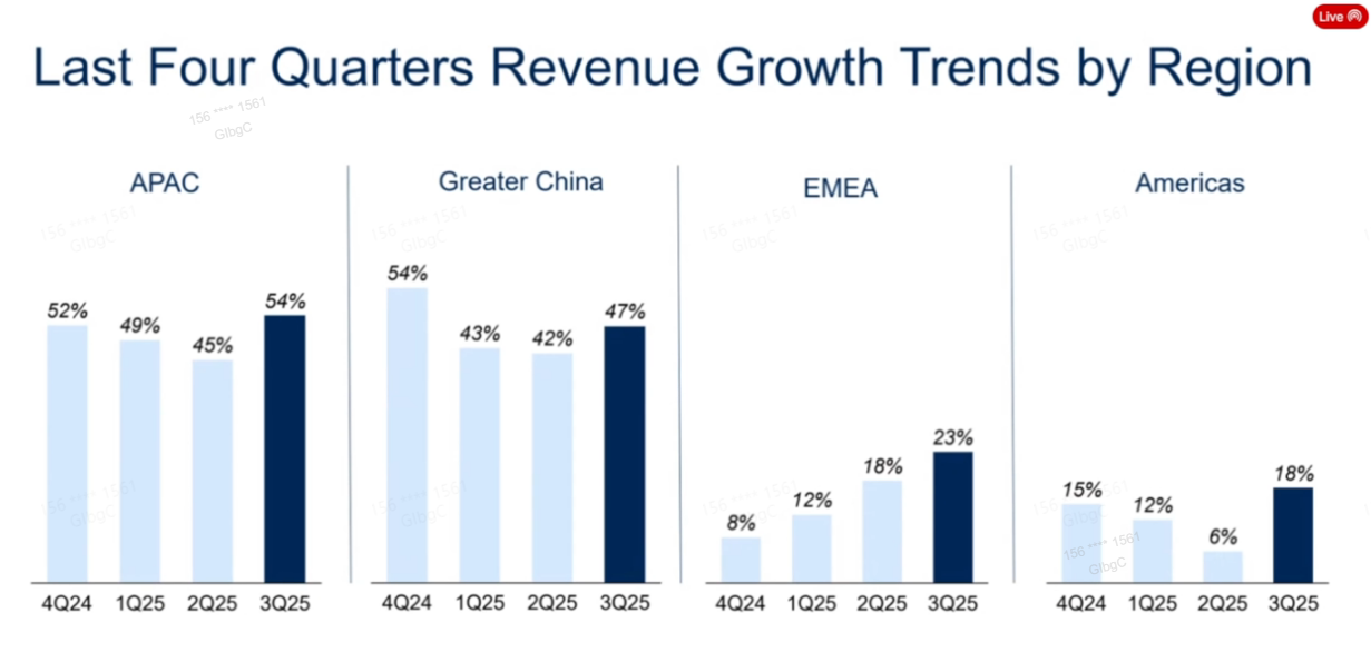 在9月的“喜马拉雅烟花事件”后,亚玛芬第三季度的业绩表现不仅超出华尔街预期,大中华区的增收更是达到47%,较第二季度的增长还高了5个百分点。此外,亚太市场的增收达到54%,欧洲、中东和非洲市场的增长为23%,美洲市场增长18%。