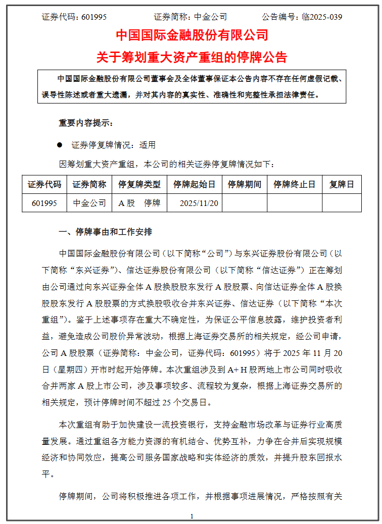 鉴于上述事项存在重大不确定性,为保证公平信息披露,维护投资者利益,避免造成公司股价异常波动,根据上海证券交易所的相关规定,经公司申请,中金公司A股股票将于2025年11月20日开市时起开始停牌。