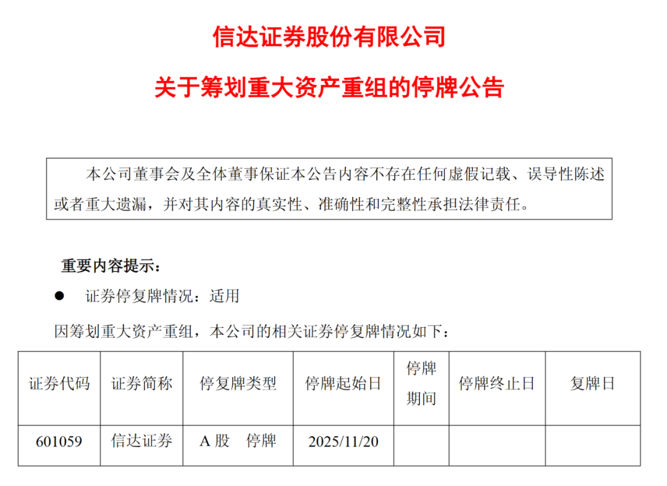 东兴证券、信达证券同日也发布了《关于筹划重大资产重组的停牌公告》。