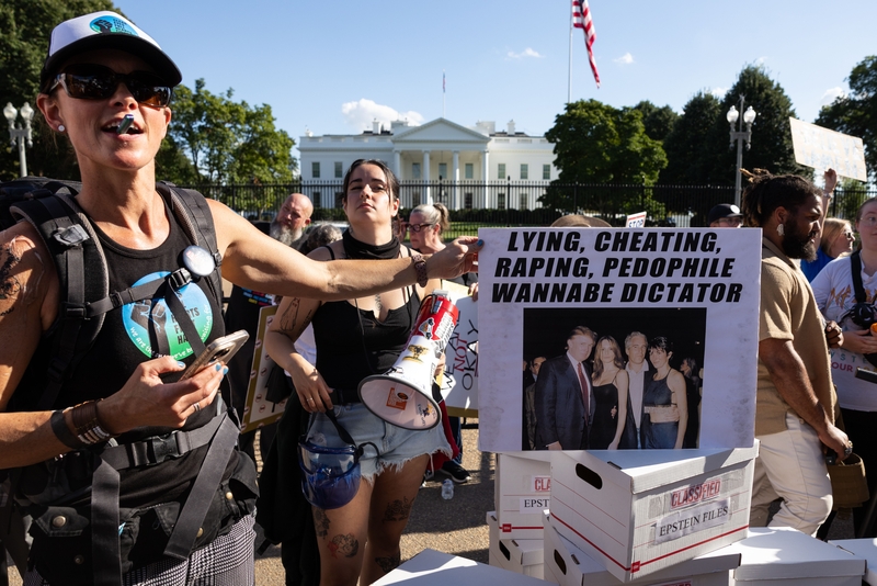 当地时间2025年9月2日,美国华盛顿特区,美国国会山前爆发反特朗普示威游行。反特朗普抗议者们高举示威标语,要求公开爱泼斯坦案机密文档。 IC Photo