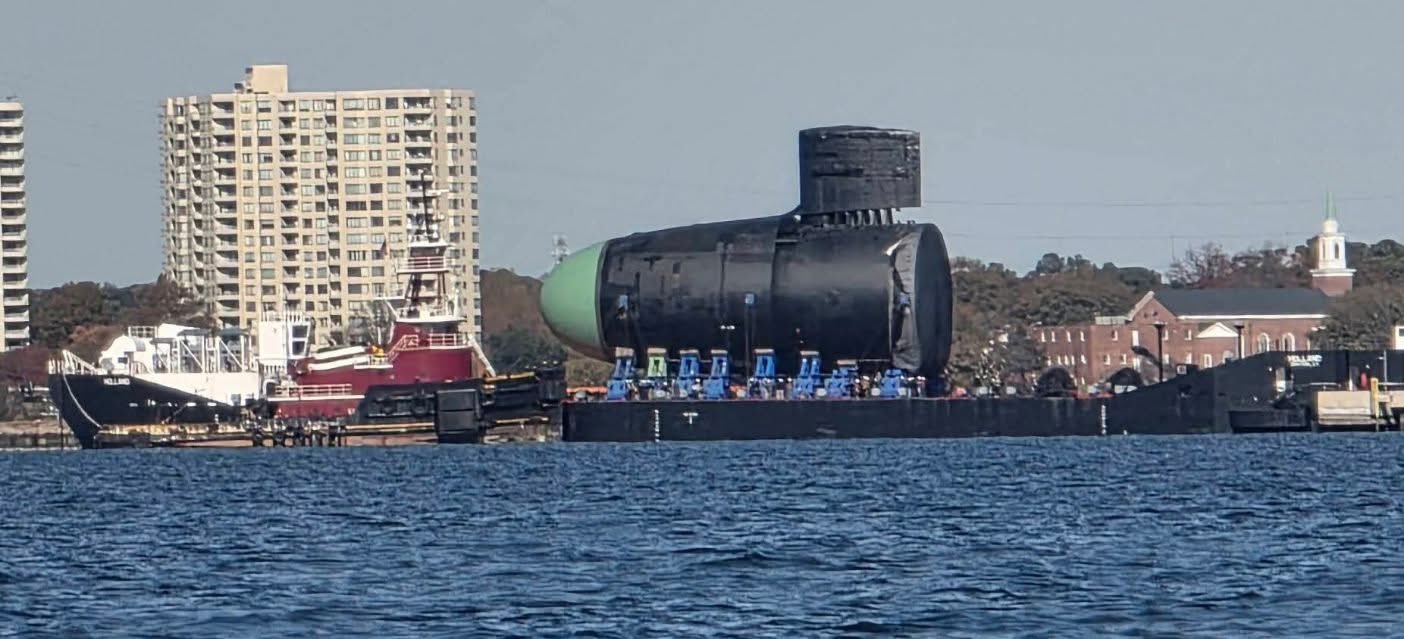 11月18日,一艘装载潜艇艇艏模块的驳船正从纽波特纽斯港出航 社交媒体