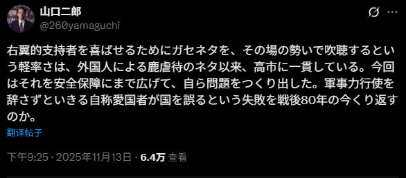 13日,他再次发文抨击高市:“自她散布外国人虐待鹿的谣言以来,高市的坏习惯一直延续至今——为讨好右翼支持者而一时冲动散布虚假消息。这一次,她将这种做法延伸到了国家安全领域,给自己带来了新的麻烦。她会不会继续重蹈覆辙呢?”