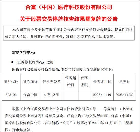 上海证券交易所网站消息,11月19日盘后,合富中国发布关于股票交易停牌核查结果暨复牌的公告。