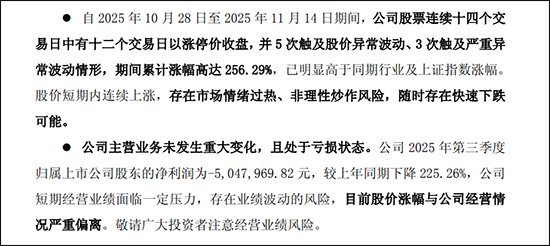 公告数据显示,自10月28日至11月14日,公司股票连续十四个交易日中有十二个交易日以涨停价收盘,累计涨幅高达256.29%,远超同期行业及上证指数涨幅。
