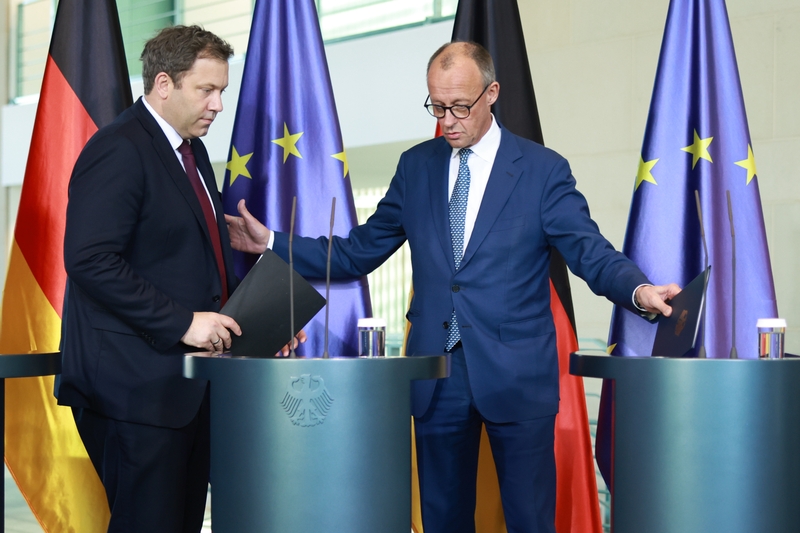 当地时间11月6日,德国政府召开“钢铁峰会”,克林拜尔(左)与默茨。东方IC