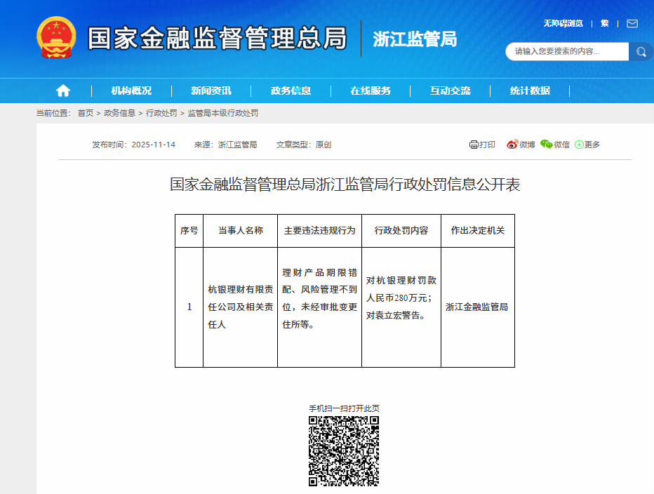 11月20日,国家金融监督管理总局浙江监管局罚单显示,杭银理财有限责任公司因理财产品期限错配、风险管理不到位以及未经审批变更住所等违规行为,被处以280万元罚款,相关责任人袁立宏则被给予警告处分。