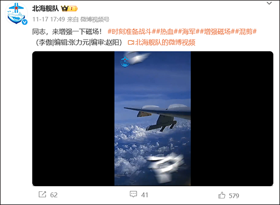 11月17日,@北海舰队 发布歌曲《来吧硝烟,来吧战场》,并配文:同志,来增强一下磁场!