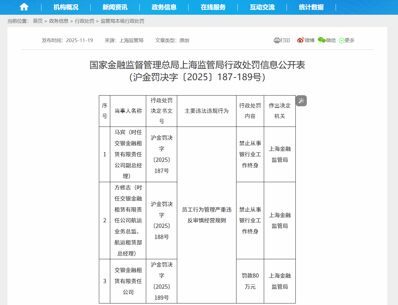 11月19日,国家金融监督管理总局上海监管局发布行政处罚信息公开表,其中显示,因员工行为管理严重违反审慎经营规则,时任交银金融租赁有限责任公司副总经理马宾,时任交银金融租赁有限责任公司航运业务总监、航运租赁部总经理方修志,被处以禁止从事银行业工作终身的处罚。